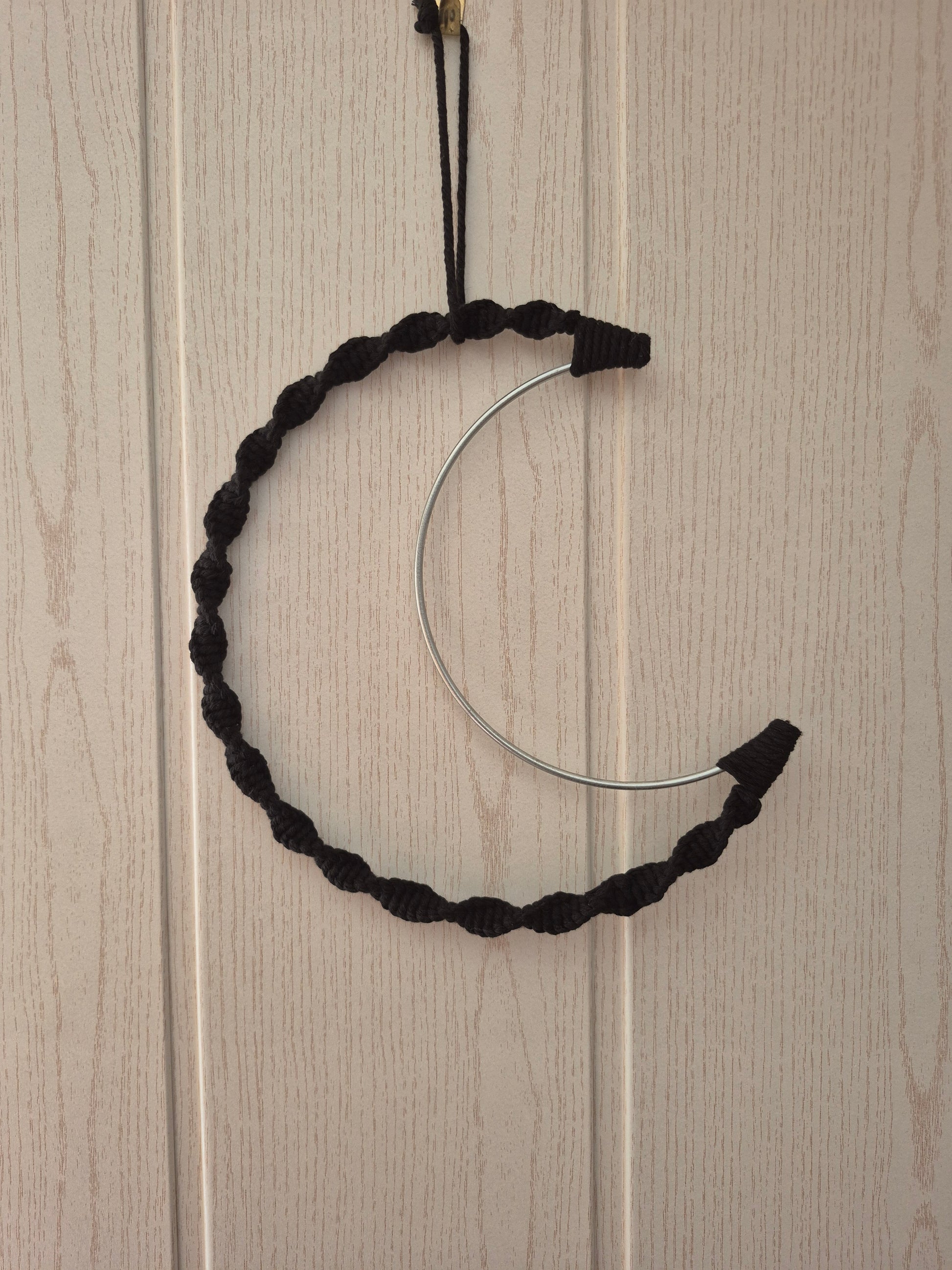 Dieser stilvolle Halbmond aus Metall und handgeknüpftem Makramee ist ein einzigartiges Dekorationselement für dein Zuhause. Der Kontrast zwischen dem silbernen Metallring und der schwarzen Baumwollschnur verleiht dem Design einen modernen, zeitlosen Look – perfekt für Minimalisten, Boho-Liebhaber oder als besonderes Highlight in deinem Raum.