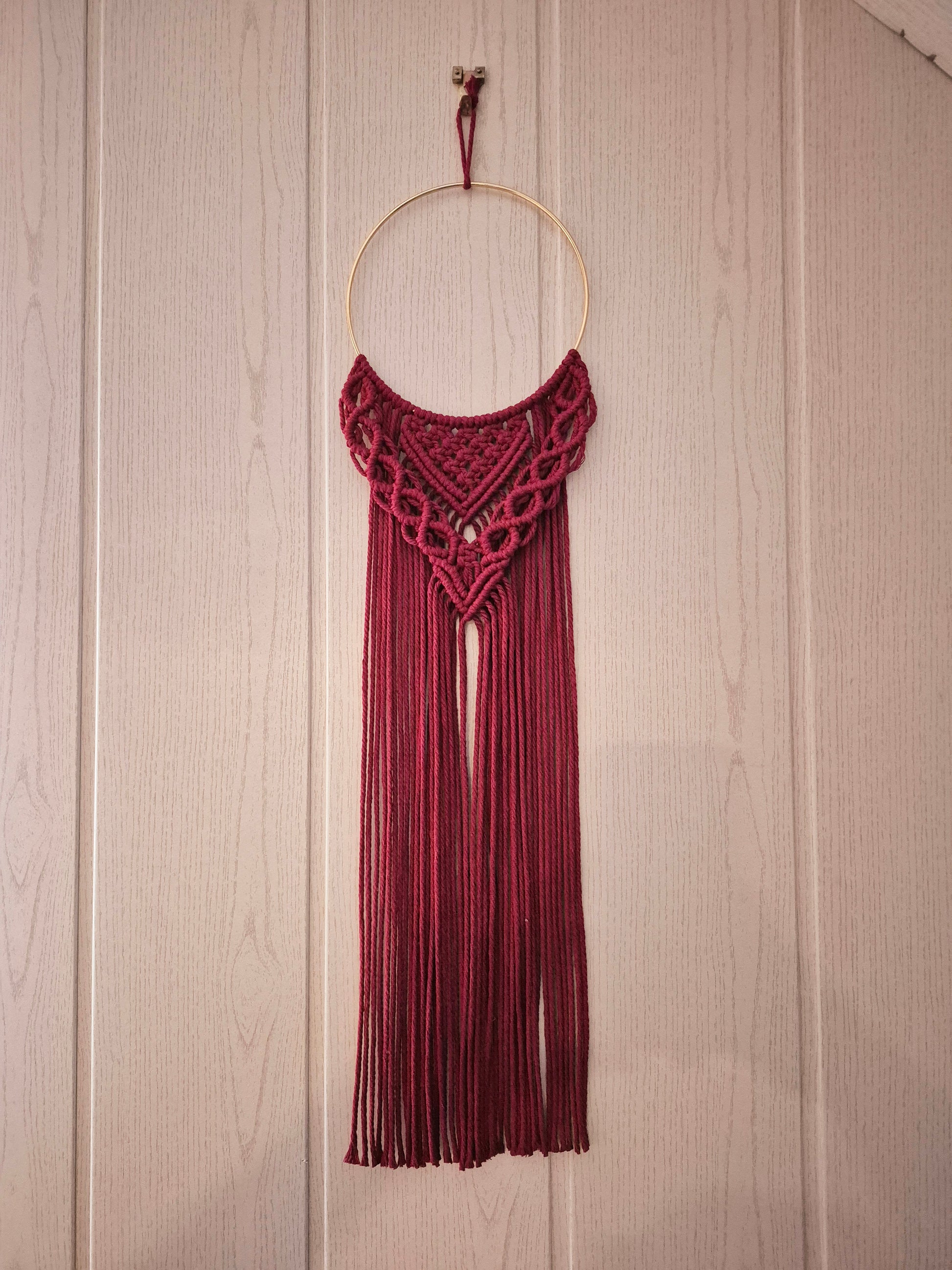 Dieser handgefertigte Makramee Traumfänger kombiniert einen goldfarbenen Metallring mit kunstvoll geknüpften Baumwollfäden in einem warmen Weinrot. Die detaillierte Knotentechnik und die langen, fließenden Fransen verleihen dem Design eine besondere Leichtigkeit und machen es zu einem stilvollen Eyecatcher für jede Wand.