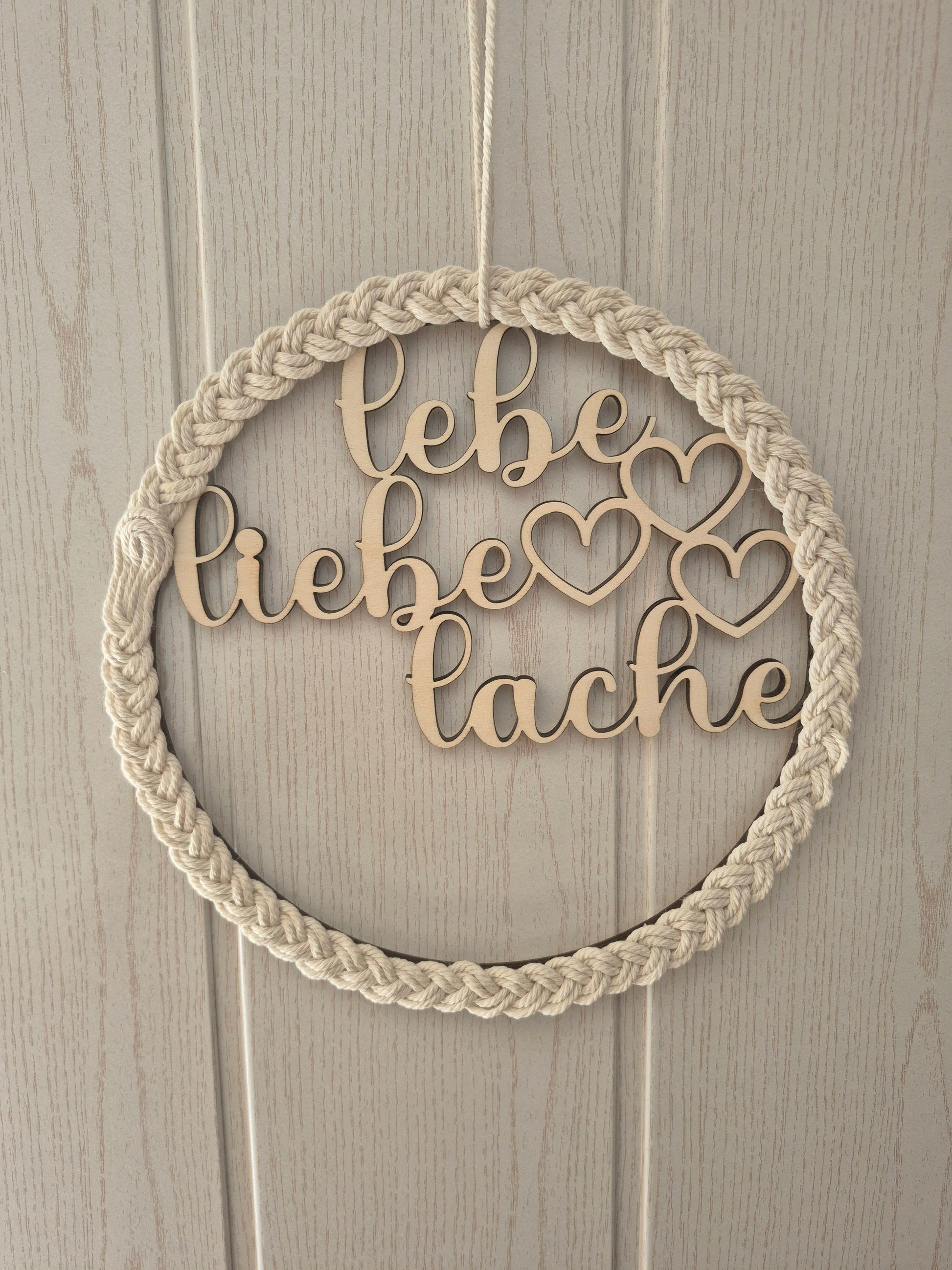 Der Ring besteht aus hochwertigem Holz mit dem Schriftzug „lebe, liebe, lache“, verziert mit kleinen Herzmotiven. Umrahmt wird er von einem handgeknüpften Makramee in beige, das dem Design eine warme und gemütliche Ausstrahlung verleiht.