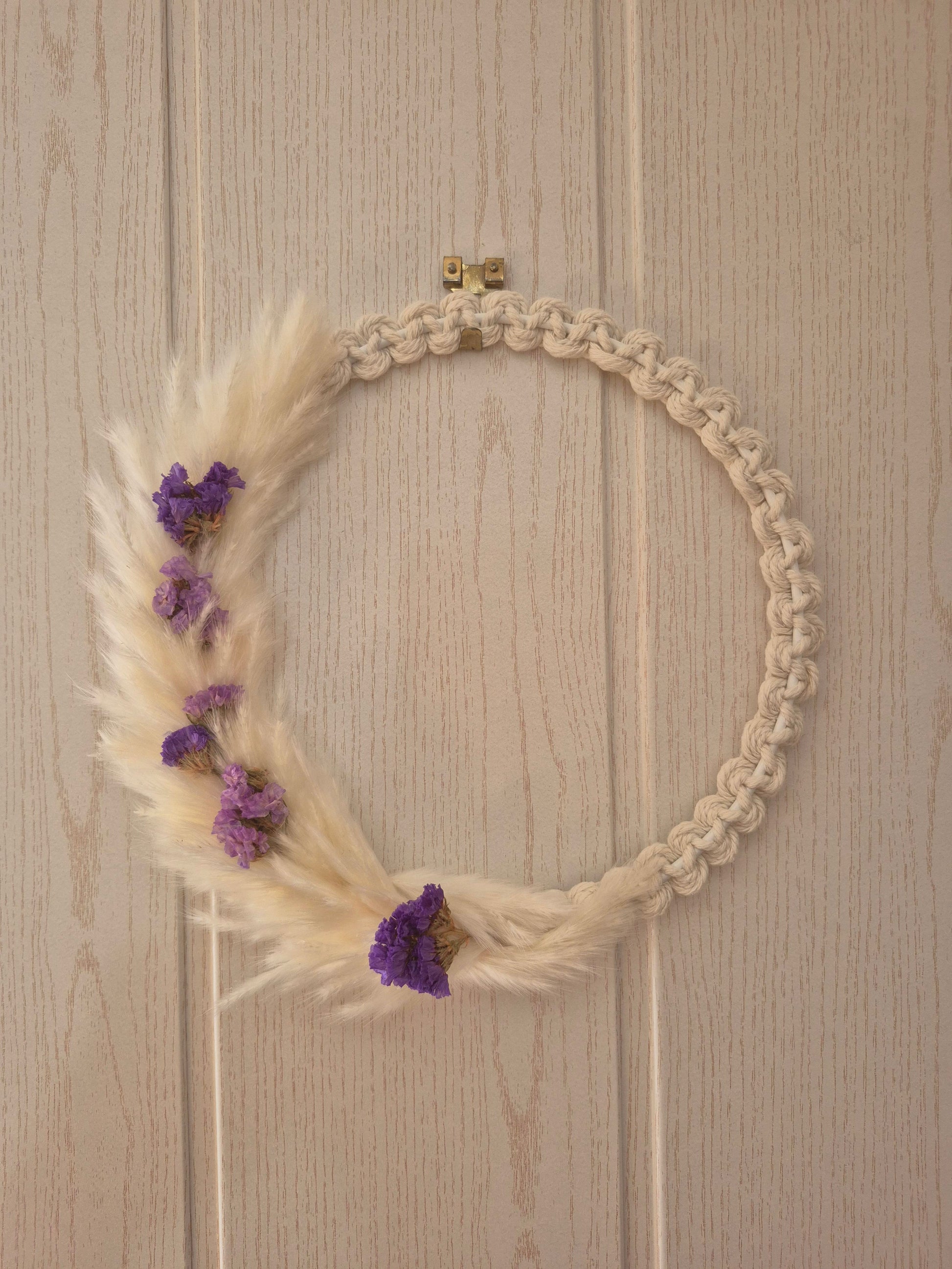 Verleihe deinem Zuhause einen Hauch von natürlicher Eleganz mit diesem liebevoll gestalteten Makramee Kranz in Beige. Der Kranz ist mit sorgfältig ausgewählten Trockenblumen in verschiedenen lilatönen verziert und schafft eine beruhigende Atmosphäre – perfekt für jede Jahreszeit.